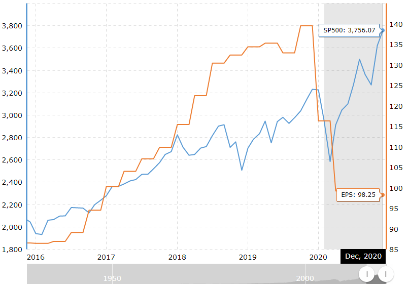 Since COVID-19 hit, we’ve seen a hard hit to earnings. This has meant that whilst earnings have dropped off a cliff, the S&P 500 has continued to rise causing a large gap between Price and Earnings. Overtime we can always expect a ‘reversion to the mean’ and at this point to quote the great man Benjamin Graham, in the short term the stock market is a voting machine and in the long term it is a weighing machine.